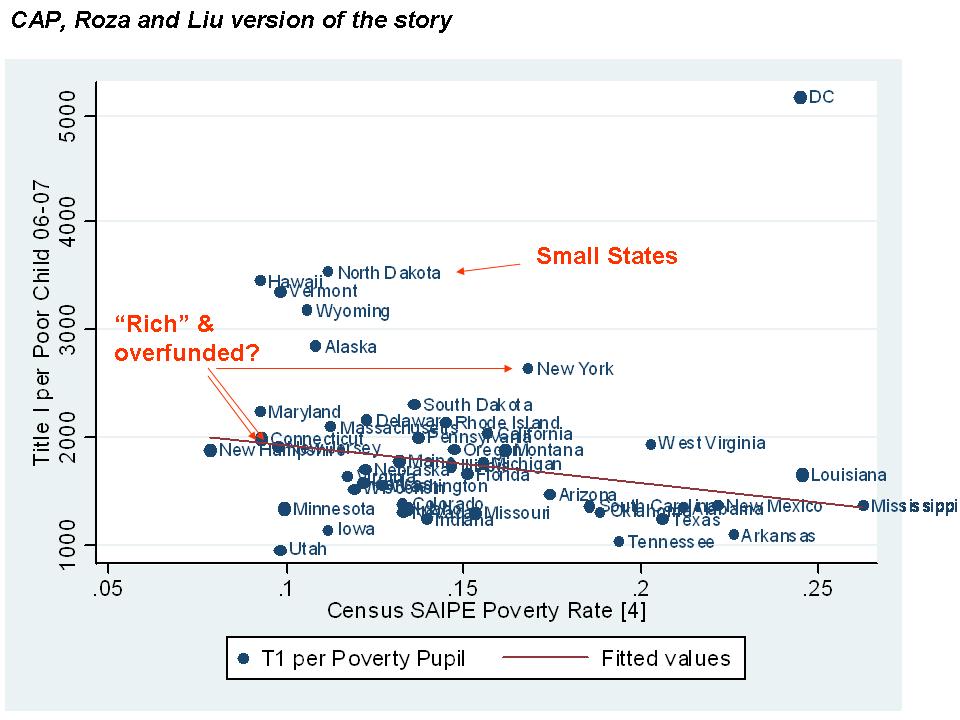 That said, there exists little excuse for excessively crude analyses which lead to such absurdly bold – AND FLAT OUT WRONG – conclusions like the conclusion that Title I makes rich states richer. Yeah – this kind of claim sounds good – makes good political rhetoric – good stump speech stuff for the absurdities of government behavior. But in this case, the CAP critique is simply wrong!