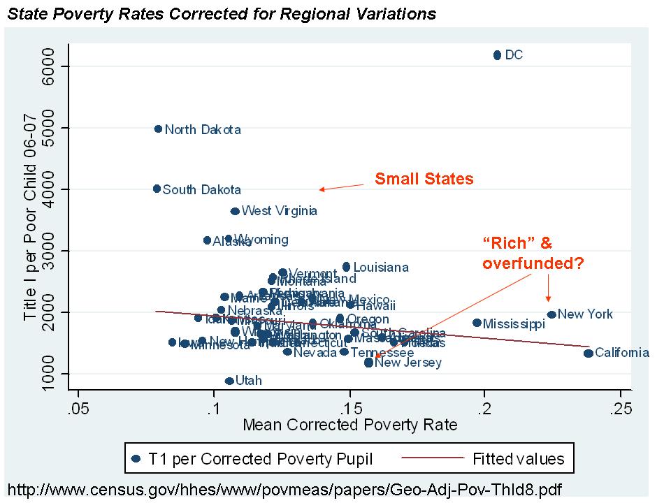 This is one fly I keep forgetting to swat, but one that has been repeatedly advanced by the Center for American Progress with excessively crude analyses. See: http://www.americanprogress.org/issues/2009/08/title1_map.html WOW! Just look at it. Those darn rich states like Connecticut, New York and New Jersey are running away with federal funding that should be targeted to poor states like Arkansas, Alabama and Mississippi.