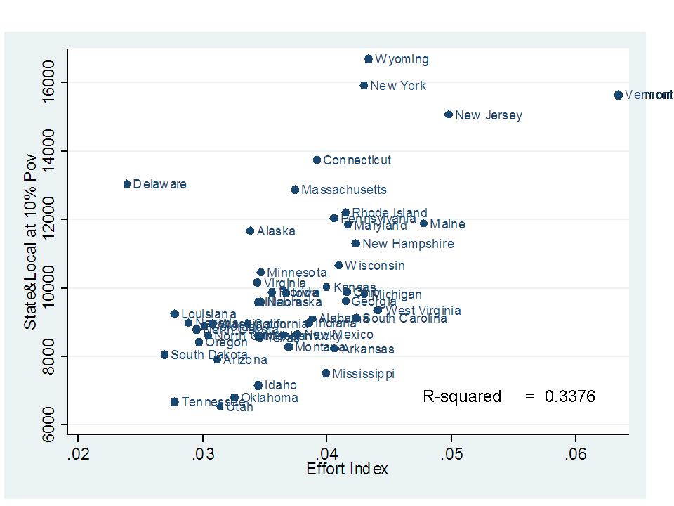 This next figure looks at the predicted per pupil state and local revenue in each state for a district having 10% poverty (relatively average for U.S. Census Poverty rates). The point here is to compare a truly comparable state and local revenue figure corrected for poverty variation, regional wage variation, economies of scale and population density. Here, we see that Utah and Tennessee (again) are standouts – having the lowest state and local revenue per pupil. Recall that both are also low to very low effort. Their revenue to districts is not low because they poor, but rather because they don’t put up the effort. But hey, they’ve got great data!!!!!