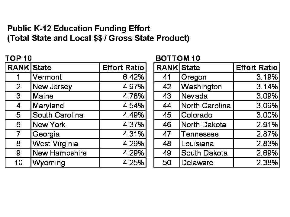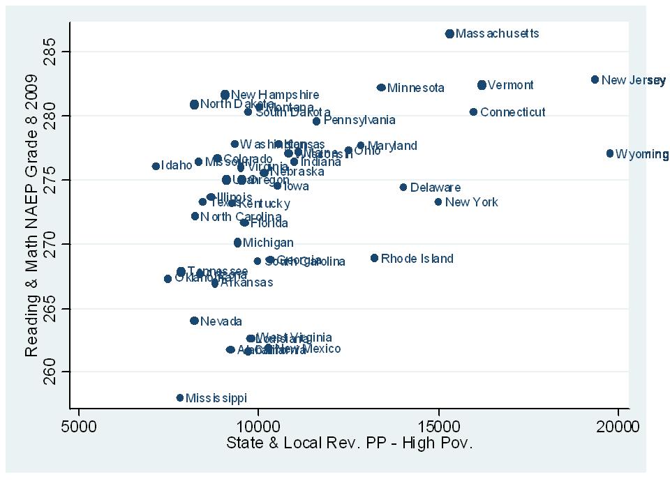 Allow me to briefly present a slightly more nuanced picture. For the past few years, and in a number of publications, I have used a statistical model of the national school finance data to correct for such issues as a) economies of scale and population density, b) regional variation in competitive wages, and c) variations in student needs. I use this model to project what a school district, with comparable characteristics, would have in state and local revenue per pupil in each state. The methods of this madness were used in this study: http://epaa.asu.edu/ojs/article/viewFile/718/831
