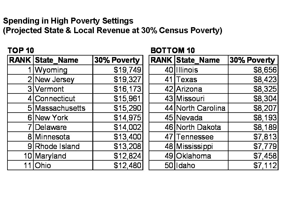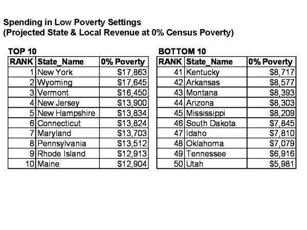 Now to the model based estimates of who’s really in the top and bottom ten on state and local revenue per pupil for elementary and secondary education. Let’s begin by looking at those states where the lowest poverty districts have the highest and lowest resources.