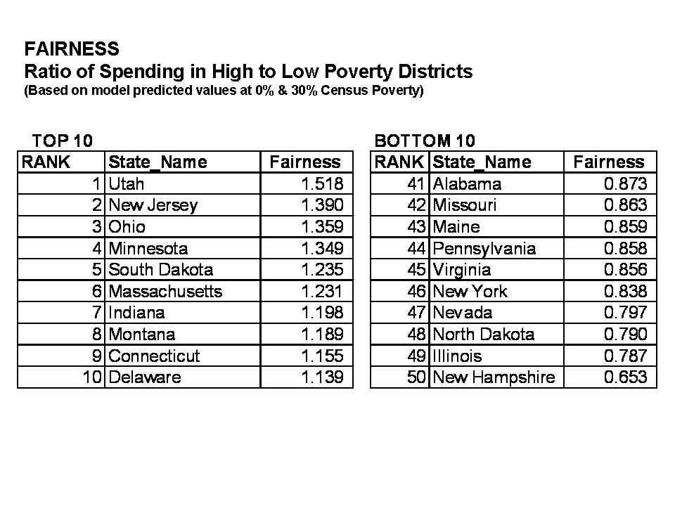 This next table ranks the within-state FAIRNESS of the state school funding distribution – where fairness is determined by taking the ratio of high poverty funding to low poverty funding – with the implicit assumption that state school finance systems should provide for additional support in districts serving children with greater needs. Now, this table must be taken in the context of the previous two. For example, Utah comes in first on “fairness.” But, in this case, this merely means that low poverty districts in Utah get nothing, and high poverty districts in Utah get next to nothing! In a twisted sense, that’s “fair?????”