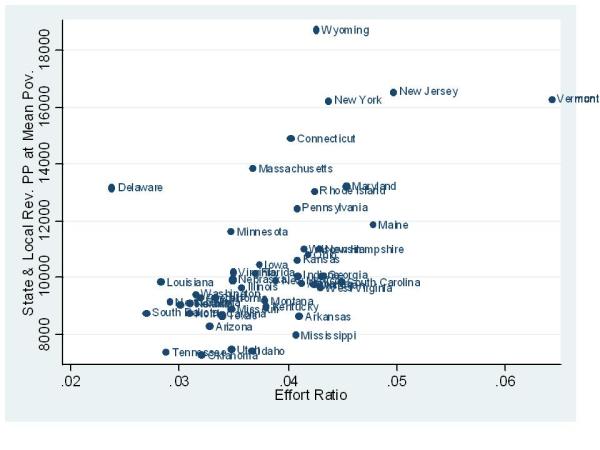 So, Mississippi is a very poor state that puts up relatively average effort, but simply can’t get very far with that effort. By contrast, Tennessee and Louisiana both have much higher fiscal capacity (measured by gross state product per capita) than Mississippi, but they simply don’t use it. Tennessee has little excuse for its spending level! Nor does Louisiana!