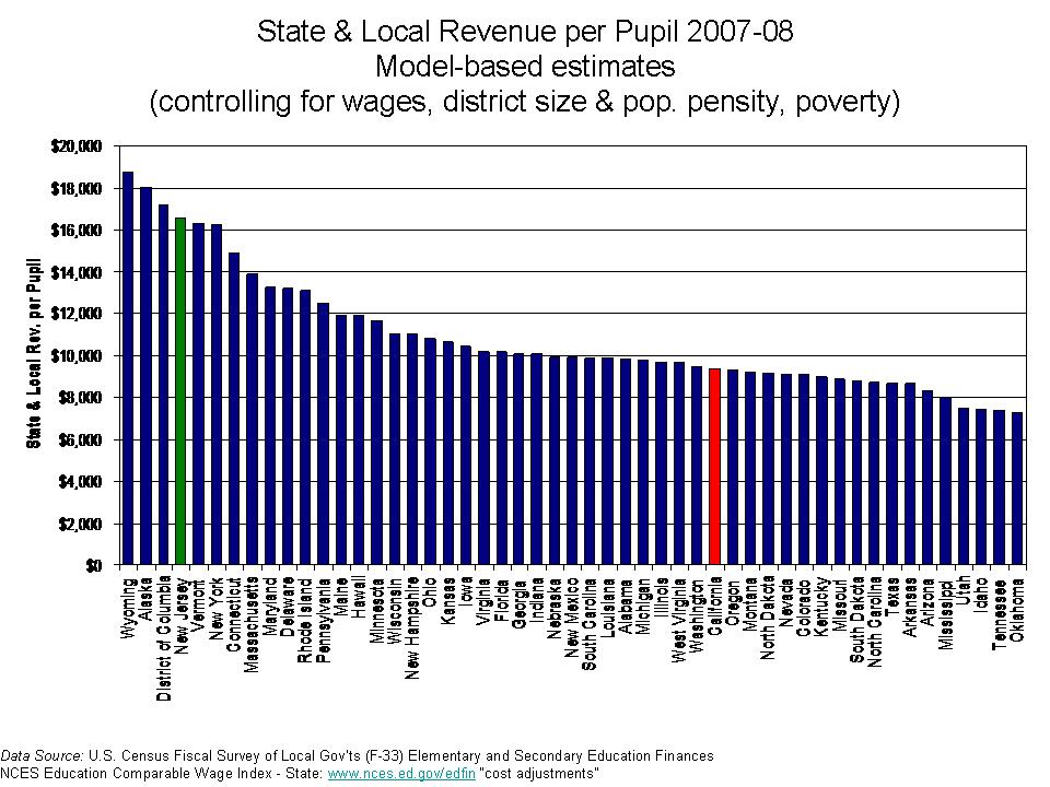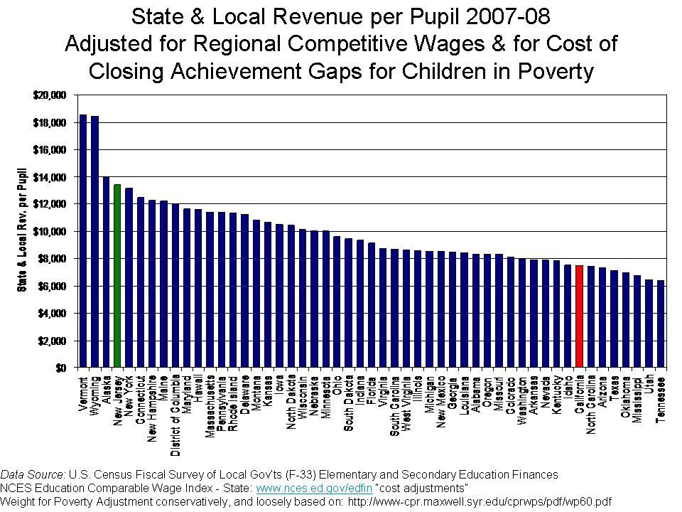 Of course, the cost of running a school varies quite significantly across states with a large share (though not all) of that variation being tied to regional differences in the competitive wage one must pay to teachers. Here, I use a competitive wage index developed by the National Center for Education Statistics (by Lori Taylor and Bill Fowler) which uses variation in non-teacher wages across labor markets to correct for variation in teacher wages. http://nces.ed.gov/edfin/adjustments.asp