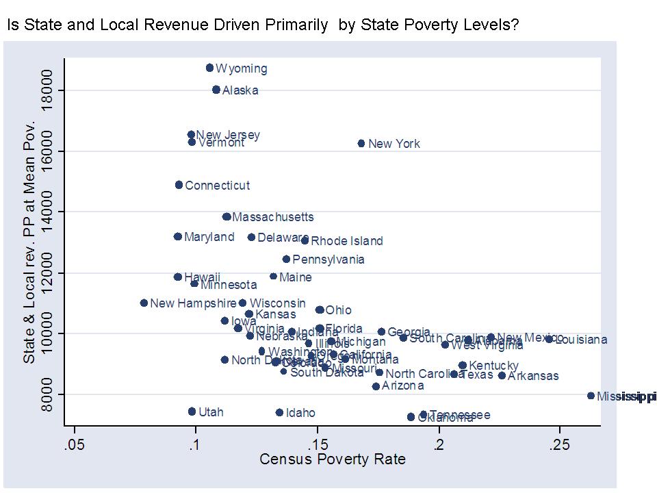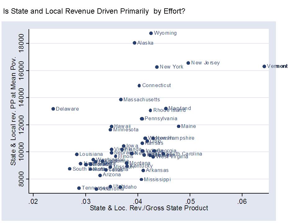 However, this final figure shows that state and local revenues per pupil are equally related to the effort a state puts up, where effort is measured in terms of state and local revenue per pupil as a share of gross domestic product by state, or gross state product. That is, some states that don’t raise much revenue per pupil simply don’t try that hard. Very few high spending states have low effort. Tennessee, Louisiana, Oklahoma, Arizona and South Dakota are near the bottom because they don’t put up much effort. Mississippi puts up average effort, but just can’t raise much revenue. I’m far more empathetic to Mississipi’s plight! Well, our highest spender, Vermont in some cases, is off the charts on effort. Despite having less capacity than states like New York or New Jersey, Vermont still manages to outspend them.