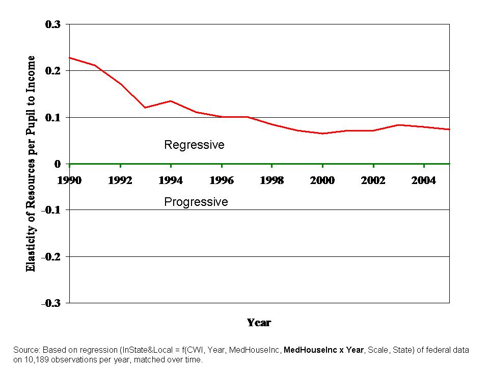 Additionally, in the second article above, Kevin Welner and I show by a similar method that overall, nationally, there remains a positive relationship between school district state and local revenues and resident income levels (across districts within states). Here’s a figure from our report, based on a regression model characterizing the relationship between median household income and state and local revenues per pupil over time. Even by 2005, that relationship remained positive – and still does through 2008. Some progress was made through 1996, and then leveled off.