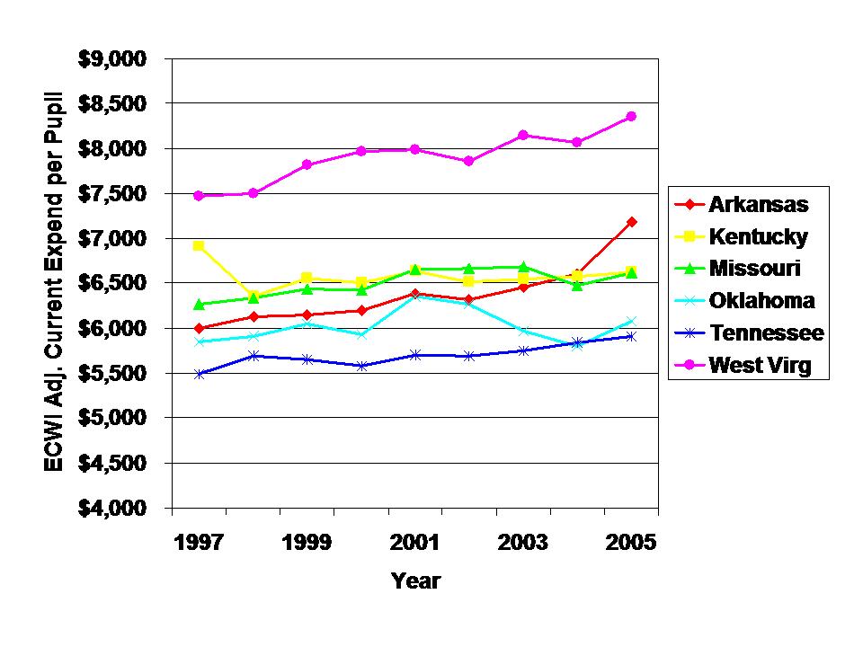 As it turns out, these states also somehow missed out on that whole bubble thing. Figure 5 shows the ECWI (Education Comparable Wage Adjustment) adjusted current operating expenditures per pupil from 1997 to 2005 (range for which ECWI is available) for states we classify as “highlands” in our fairness report. Adjusted for competitive wage growth (of non-teachers in same labor markets), per pupil spending in Tennessee stayed a) relatively flat and b) below all others in its region. Where’s their bubble? Where’s all of that punch drunk public spending? Well, perhaps if we could take it back to about 1920 or so. Then we’d find the bubble?