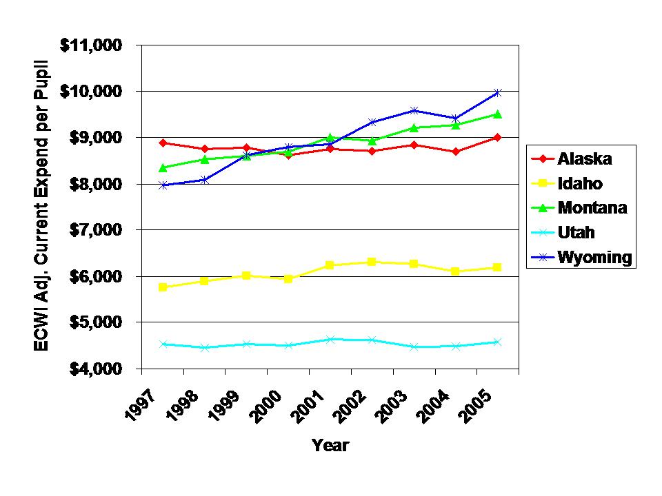 Utah is my new favorite standout these days, and is shown in this figure.Yeah… you have to look carefully to find Utah per pupil spending down their blending in with the horizontal axis of the graph. Utah per pupil spending is a) absurdly lower than all others around it and b) really, really, flat over time. Hey, where’s that bubble? Where’s all that punch drunk public expenditure? In fact, the only state with a really steady climb in spending here is Wyoming (perhaps Montana also).