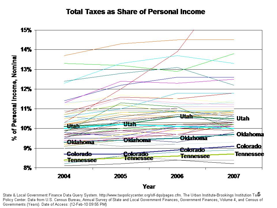 Oh, and back to that issue of how all of these states have taxed themselves to oblivion to support that punch drunk spending binge. This figure shows the cumulative taxes as a percent of income with a handful of states including Utah and Tennessee identified. Note that for most states, these trends change little even if we take the graph back to 1980. While the above “effort” figure focuses only on public K-12 funding as a share of gross state product, this graph focuses on all tax revenues as a share of income. Yeah… Tennessee and Utah really taxed themselves to death to support their massive spending bubble (albeit my time line is slightly different… but heck… there wasn’t a bubble anyway). We really need to bring their taxes and spending back into line. Really!