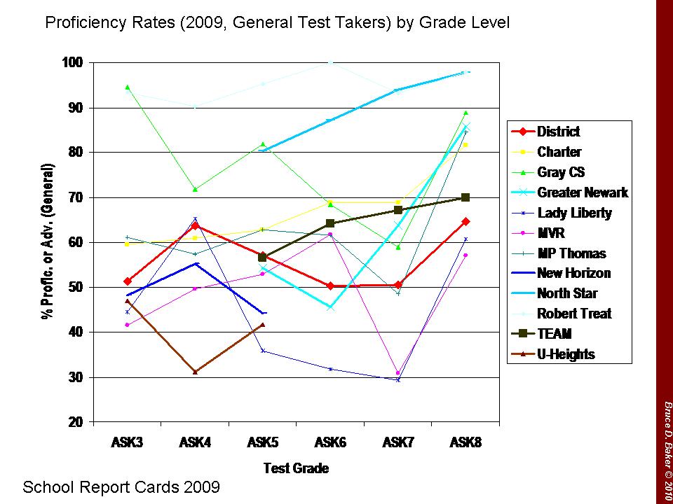 First, the mix of schools that are charter schools serving 8th grade students is different from the mix serving 4th grade students. Heavy “cream-skimmers” like North Star Academy start at 5th grade. And some lower performing charters, actually serving more representative populations end at 4th grade. The different mix of charters having students taking the 8th grade test versus those taking the 4th grade test may explain a substantial portion of the difference. It’s also important to understand that at this break – where low performers end – and where high performers start up – that many low performing students may be pushed back into NPS schools and meanwhile, higher performing ones creamed off. Here are the charter school proficiency rates (general test takers only) from 2009 state report cards, along side NPS proficiency rates (averaged across tests).
