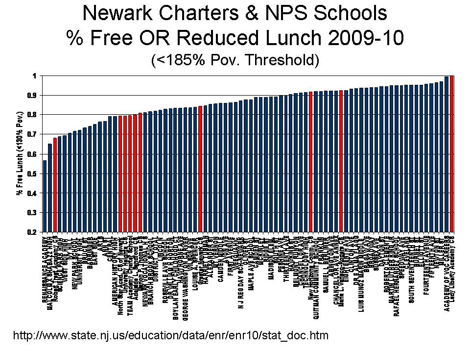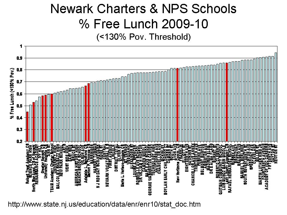 These data are highly consistent (except for Lady Liberty) with my 2008-09 data from the National Center for Education Statistics Common Core of Data. Most Newark Charter Schools, especially the frequently touted high performers, have very low relative rates of children below the 130% poverty threshold.