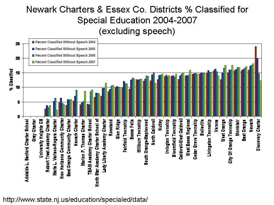 NJDOE has not posted the more recent classification rate data by the same format. Enrollment files used in the first part of this post have disaggregated classification data, but report mostly “0” values for charters because counts were too small to report. NJDOE does report placement data, but again, these data are spotty at best for NJ Charter schools.