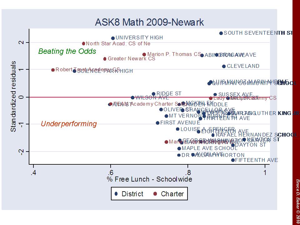 In this figure (ab0ve), we see that North Star certainly beats the odds at 8th grade. Now, we can also already see that North Star has a much lower % free lunch than nearly any other school in Newark, limiting scalability right off the bat. There just aren’t enough non-poor kids in Newark to create many more schools with demography like North Star. Not to mention the complete lack of children with disabilities or limited English language proficiency.