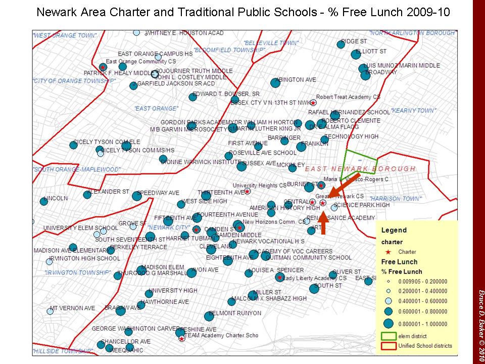 Here’s North Star on the map, in context. Smaller lighter circles are lower % free lunch schools. Most of the charters in this map are… well.. smaller lighter circles (with charters identified with a red asterisk). Not all, however, are as non-representative as North Star.
