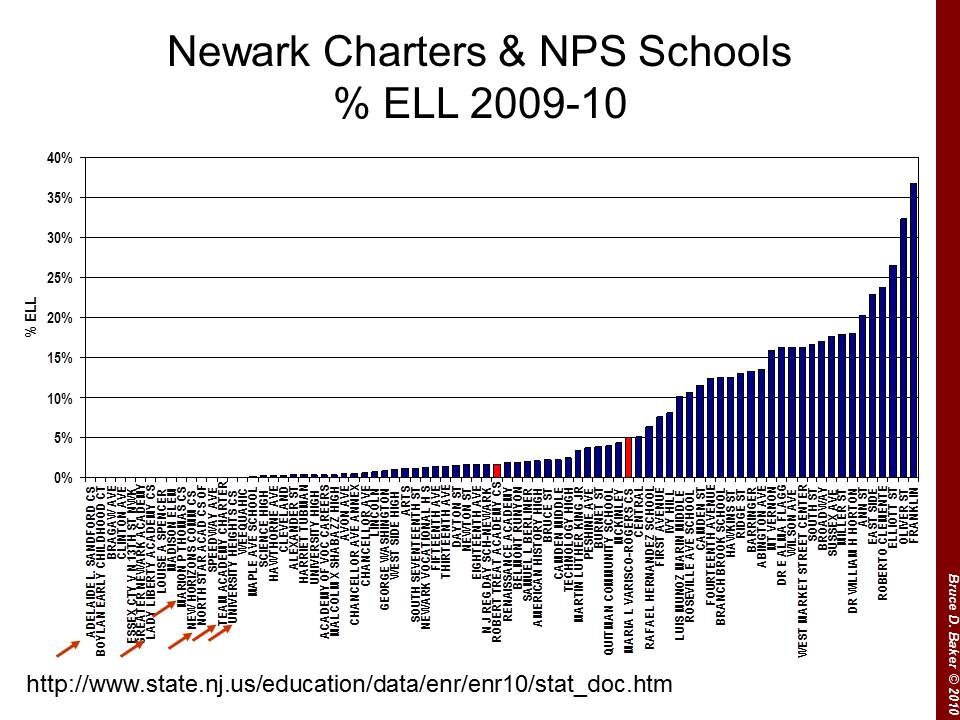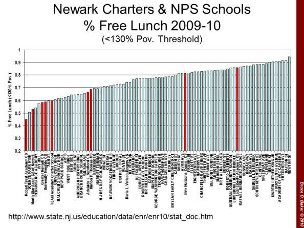 Here are a few slides from previous posts on the demography of Newark Charter Schools in particular, compared to other Newark Public Schools. Here are the shares of kids who qualify for free lunch by school in Newark (city boundaries). Clearly, most of the charters fall toward the left hand side of the graph with far fewer of the lowest low-income children.