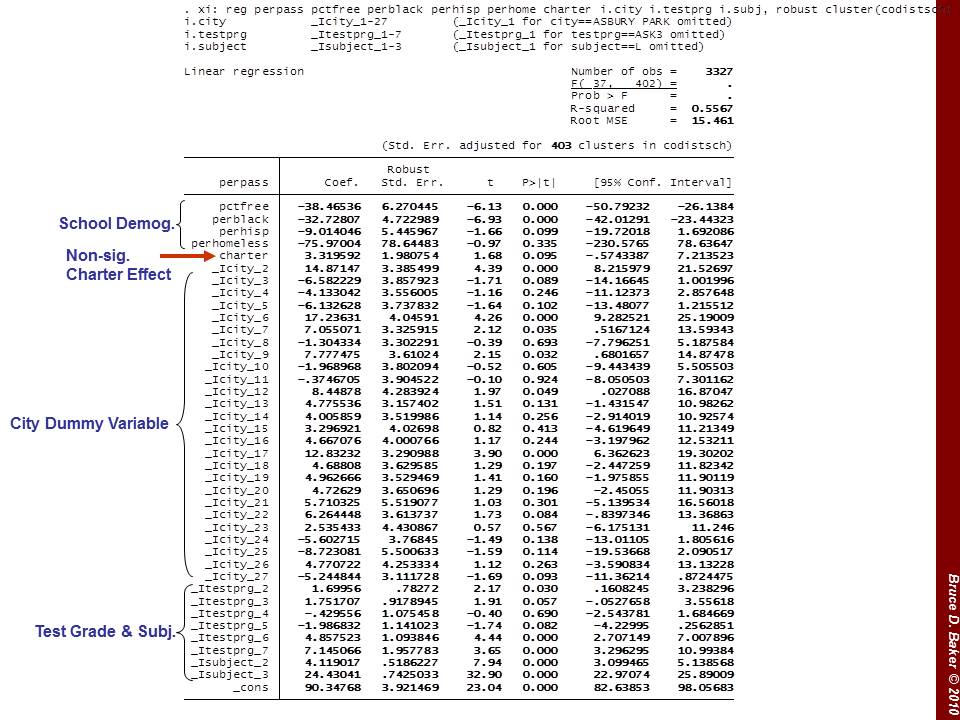 Using this oversimplified method, the analysis (statistical output) below shows that the charter average proficiency rate is about 3% higher than the non-charter average – BUT THAT DIFFERENCE IS NOT STATISTICALLY SIGNIFICANT. That is, there really isn’t any difference. THAT IS, THERE REALLY ISN’T ANY DIFFERENCE.