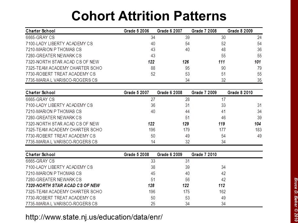 My point here is not that these are bad schools, or that they are necessarily engaging in any particular immoral or unethical activity. But rather, that a significant portion of the apparent success of schools like North Star is a) attributable to the demographically different population they serve to begin with and b) attributable to the patterns of student attrition that occur within cohorts over time.