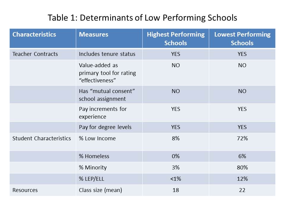 Conclusion: The cause of some schools failing and others succeeding is clearly the absence of regular use of clear metrics for teacher evaluation and the absence of mutual consent school assignment policies. It is also likely that basing salaries on experience or degree level adds to the dysfunction of low performing schools.