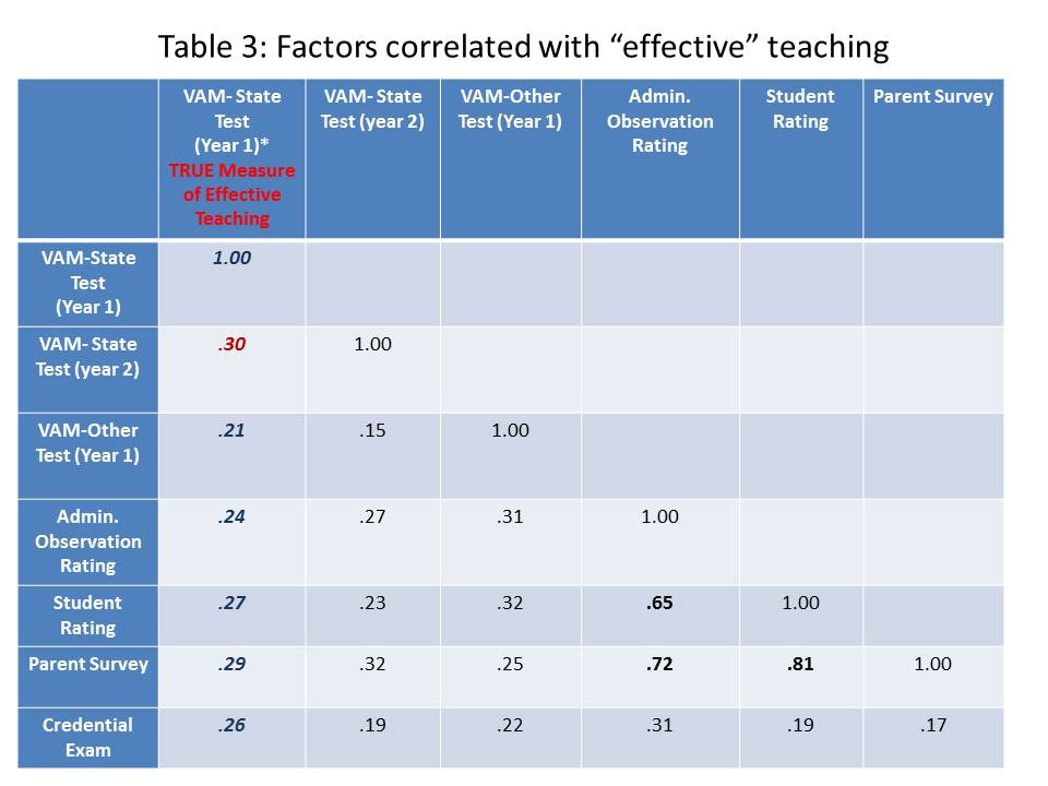 In the third and final paper, economists from the the Measuring Yearly Advancements in Social Science project released preliminary findings from a massive privately funded study on teacher effectiveness. Specifically, the study endeavors to determine the correlates of effective teaching, in order to guide public school district personnel policies – specifically hiring, retention and compensation decisions. The study involved 22,543 teachers (326 of whom had complete data on all observations) across 6 cities (4 of which failed to provide sufficient data in time for this preliminary release). Using two years of data on students assigned to each teacher (using only the 4th grade math assessment data, because correlations on language arts assessments were too unreliable to report), the study investigated which factors are most highly related to a TRUE measure of teaching effectiveness – where true “effectiveness” was defined as the contribution of Teacher X, to achievement growth in 4th grade math on the STATE assessment for students S1 – Sy, linked to that teacher in the given year (Equation expressed in Appendix A, pages 69-74). The same students were also given a second math assessment. School principals conducted observations 5 times during the year and filled out an extensive evaluation matrix based on teacher practices and student – teacher interactions. Students were also administered surveys, as were parents of those students, requesting extensive feedback regarding their perceptions of teacher quality. The correlations are shown in Table 3.
