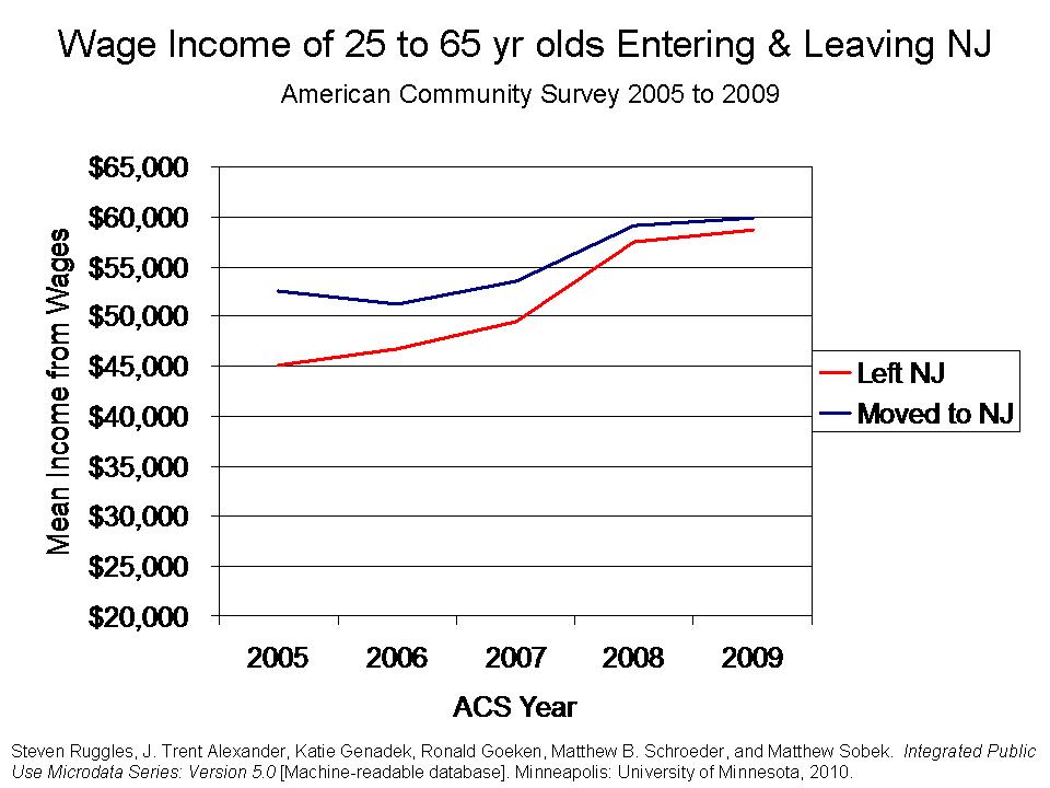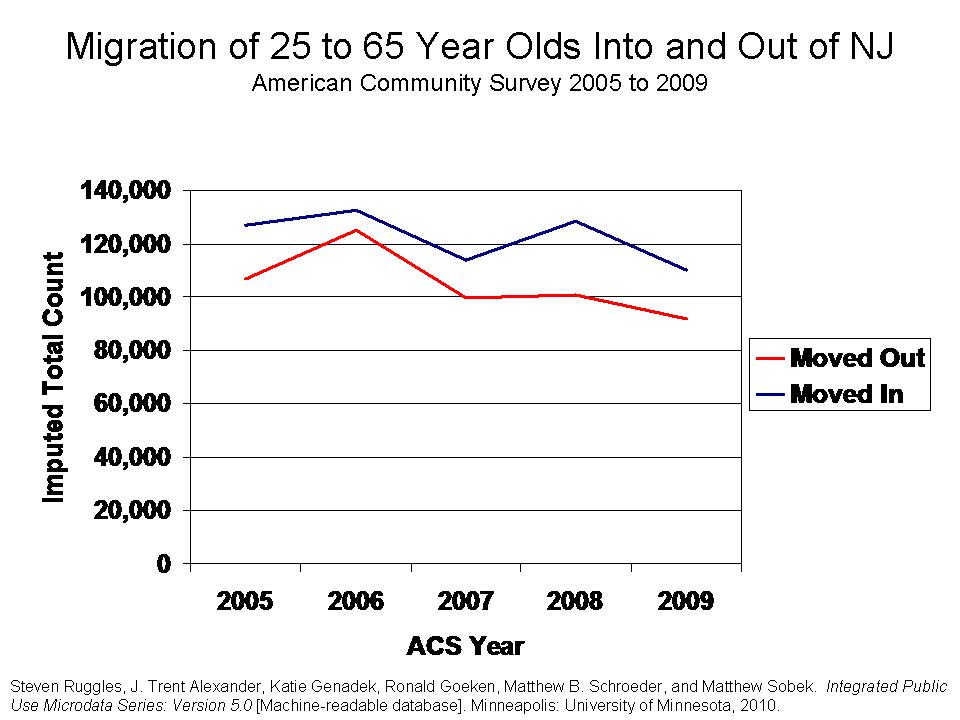 For this one, the graphs pretty much tell the story. I’ve had these data sitting around for a while and just never got around to making the graphs. I’ve used data on migration patterns across cities and states from the American Community Survey in the past. The American Community Survey data are annual survey data which, among other things, include information on employment status, place of residence, place of work, wage income, household income and a bunch of other useful stuff. Since 2000, ACS has been doing annual data collection and has increased sample sizes from 2005 to 2009, increasing the questions that can be addressed with the data. The ACS data also include questions regarding whether the respondent lived in a different location the previous year. Since you have the current year location, whether an individual lived elsewhere the previous year, and where they lived, it’s relatively easy to tabulate characteristics of individuals who a) live in New Jersey in the current survey year but lived elsewhere the previous year, (Moved In) b) live in another state in the current year, but lived in New Jersey the previous year (Moved Out), or c) lived in New Jersey in the current and previous year (STAYER).