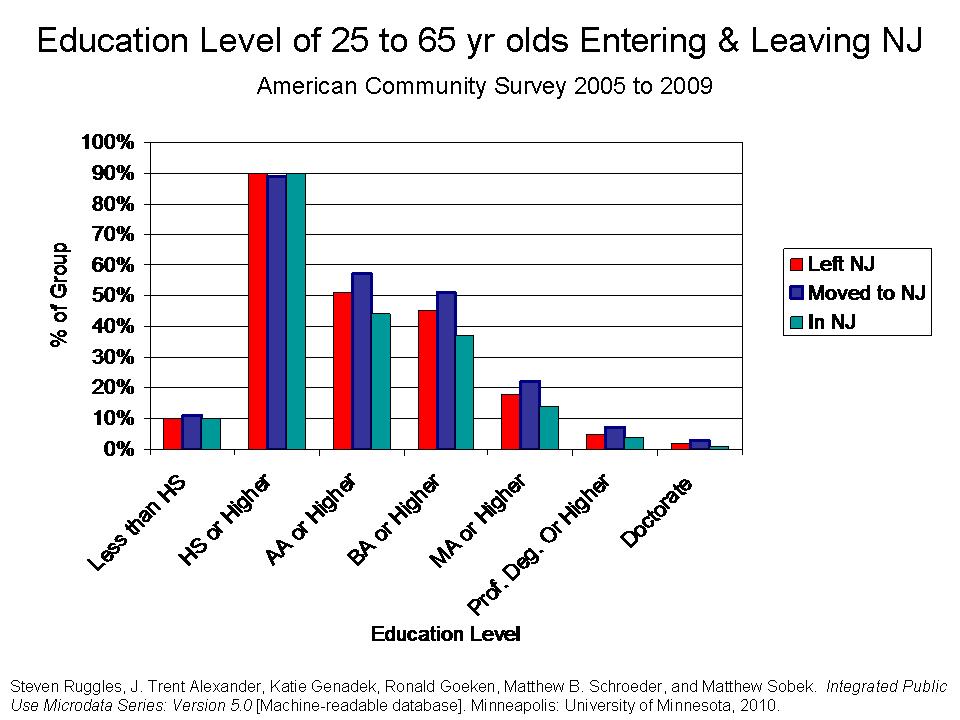 This figure shows that on average, those coming into New Jersey have higher levels of education than those leaving. The blue bars, from associates degree or higher, through every higher level of education, are higher than the red bars. That is,those coming into New Jersey tend to be more likely to have a BA or higher, an MA or higher, or a professional or doctorate degree than those leaving New Jersey.