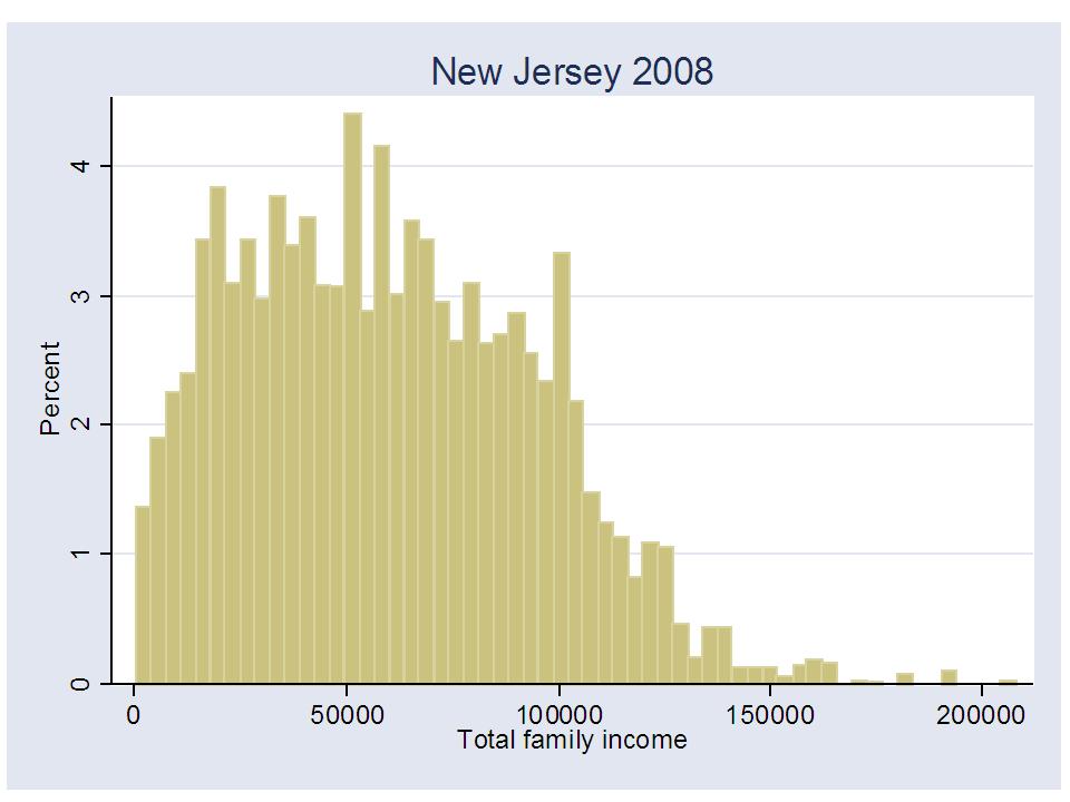 Here are graphs of the poverty distributions (using a poverty index where 100 = 100%, or income at the poverty level) for families of 5 to 17 year olds in New Jersey and in Texas. These graphs are based on data from the 2008 American Community Survey (from http://www.ipums.org). They include children attending either/both public and private school.