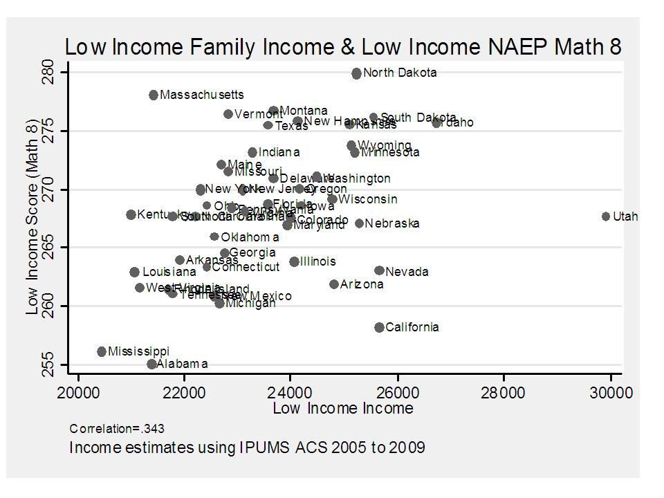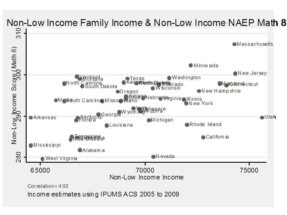 There is a modest relationship between income levels of non-low income children and NAEP scores. Higher income states generally have higher NAEP scores. No adjustments are applied in this analysis to the value of income from one location to another, mainly because no adjustments are applied in the setting of the poverty thresholds. Therein lies at least some of the problem. The rest lies in using a simple ABOVE vs. BELOW a single cut point approach.