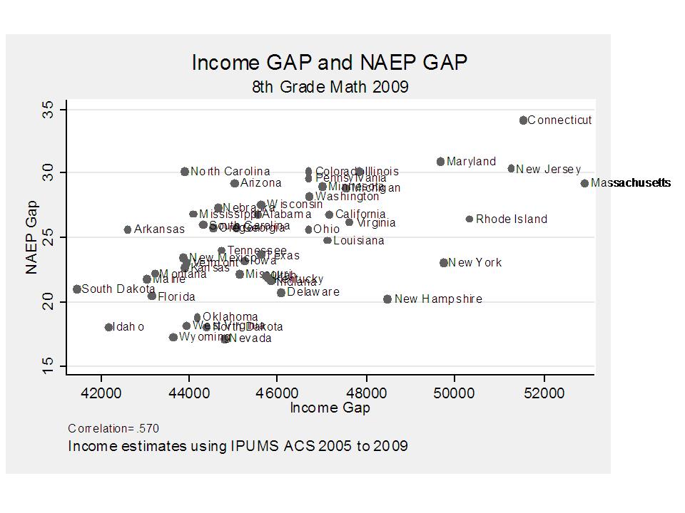 If there is much of a relationship between the income gaps and the NAEP gaps – that is, states with larger income gaps between the poor and non-poor groups also have larger achievement gaps – such a finding would call into question the usefulness of state comparisons of these gaps.