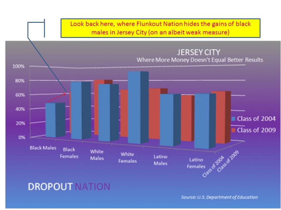 Yes, Biddle’s entire counter to the body of research he has not and will not read, is to use this graph of “promoting power” by student race group for Jersey City, NJ in 2004 and 2009. Note that the infusion of additional funds in NJ occurred mainly from 1998 to 2003, leveling off thereafter. But that’s a tangential point (not really). So, Biddle’s absolute verification that more money doesn’t matter is to simply assert without verification that Jersey City got a whole lot more money and then to use this graph to argue that nothing improved!