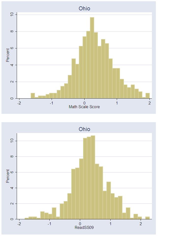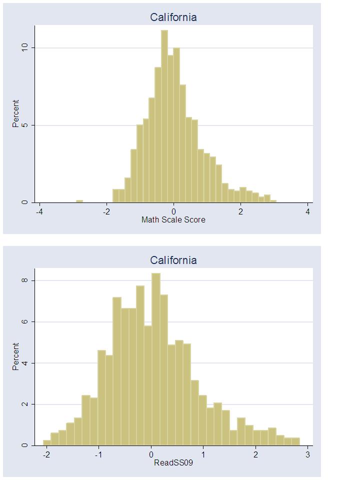 Let’s take a look at some of the actual district level distributions of standardized mean scale scores on state assessments. Remember, Green and McGee’s triple normative leap only works well to the extent that state assessments are a) normally distributed, b) have similar range and c) are not particularly skewed in one direction or the other.