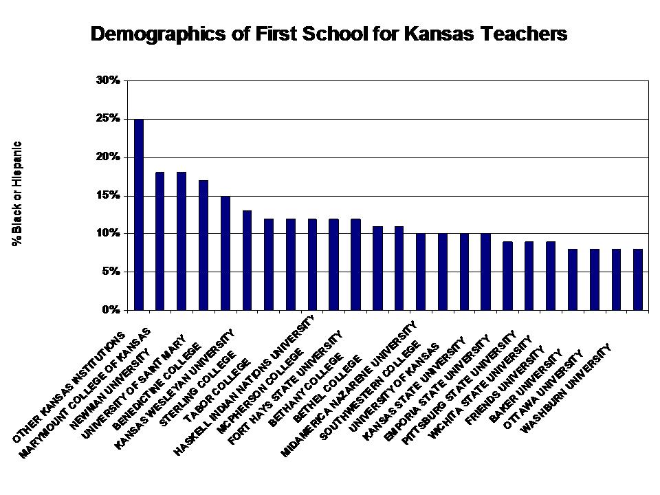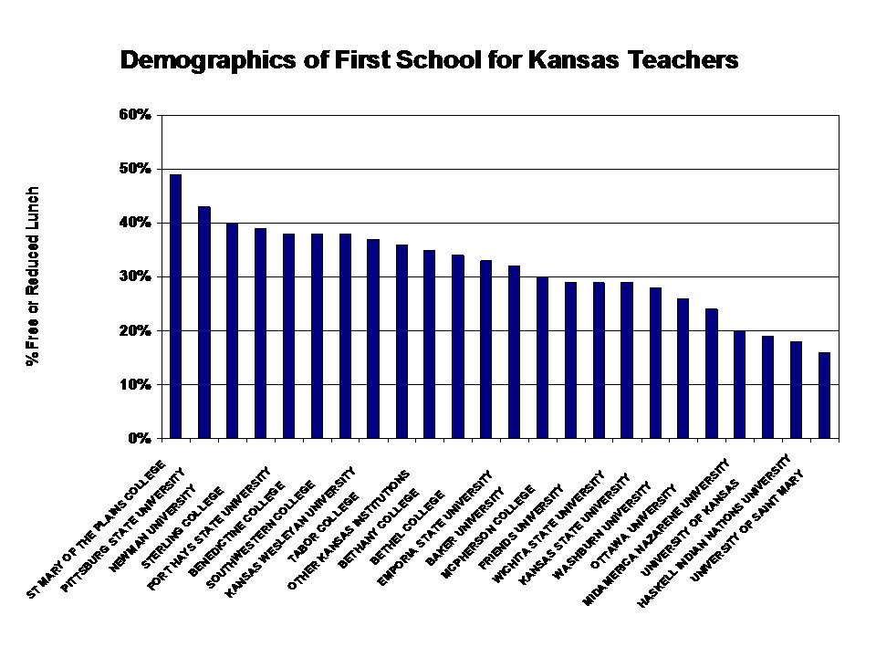 I showed previously how the rates of children qualifying for free or reduced price lunch varies significantly across schools of graduates of Kansas teacher preparation programs: