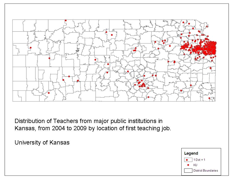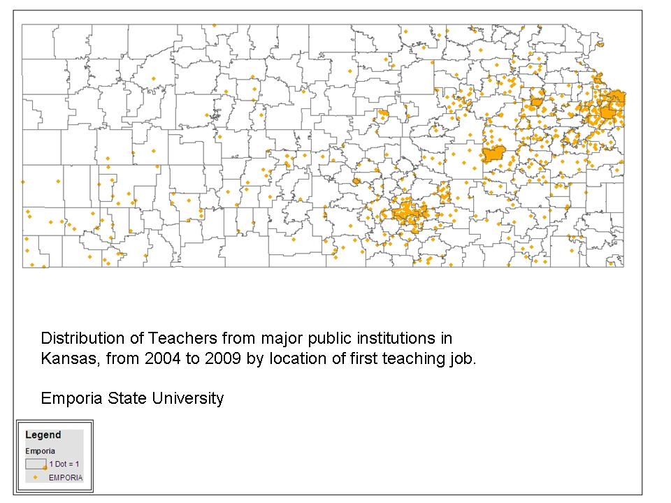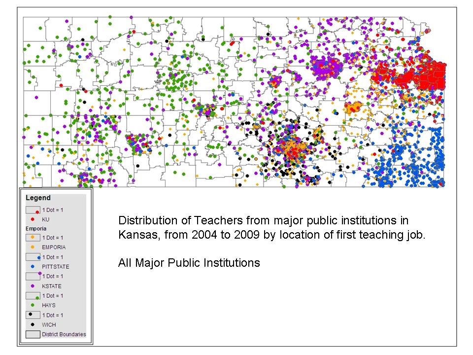 Here’s the geographic distribution of teacher graduates of the major public teacher preparation institutions in Kansas:
