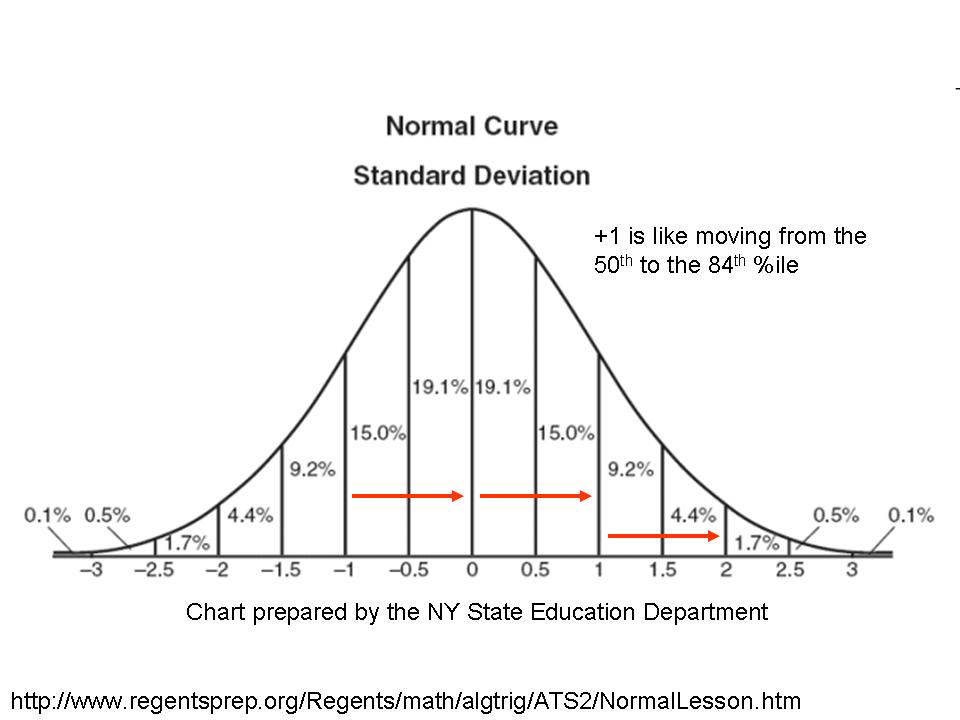 So, how crazy is it to assert that these reforms can create a full standard deviation of improvement up the productivity curve – for example, if we spend $25,000 per pupil on tech-based systems as opposed to $5,000 per pupil on tech-based systems? Well, here’s the “standard normal curve” which, for fun, I obtained from the NY Regents Assessment study guide. That’s right, this is from the study guide for the NY Regents test. So perhaps the members of the Board of Regents should take a look. A full standard deviation of improvement would be like moving a class of kids from the 50%ile to the 84.1%ile. That’s no simple accomplishment!