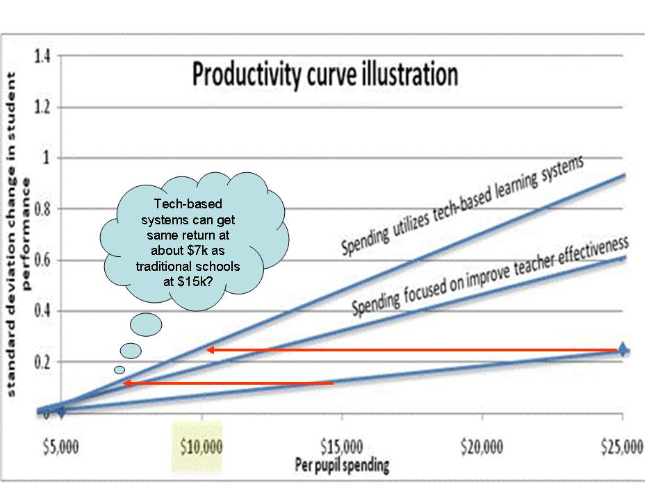1. Indeed that appears to be what was done here – simply making up productivity advantages of imaginary – or at least very imprecisely characterized alternative technologies for schooling.