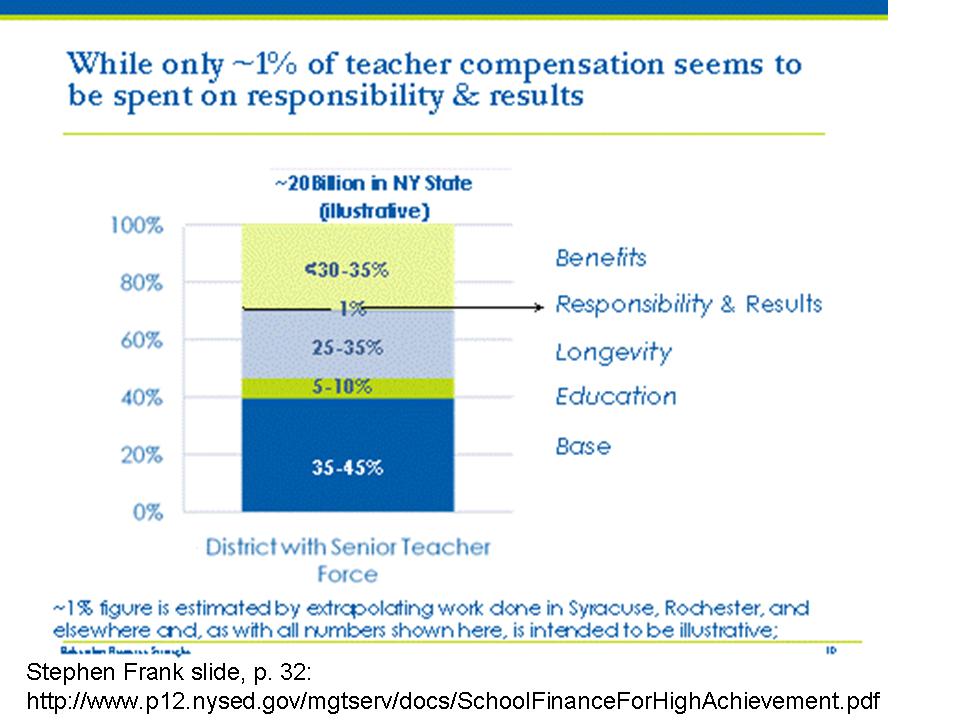 For example, Stephen Frank presented slides to suggest that any and all money in the education system that is spent on a) teacher pay for experience above base pay or b) teacher pay for degree levels (any and all degrees) above and beyond base pay c) any compensation for teacher benefits, is essentially wasted and can and should be reallocated.  Here’s one of the slides: