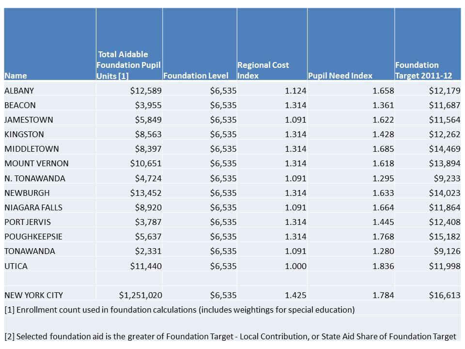 We can apply these calculations to determine the aid that should have been received in 2011-12 by several of the state’s small cities and by New York City, based on data and parameters from state aid runs as provided on April 1, 2011. (again… this is how it hypothetically works).