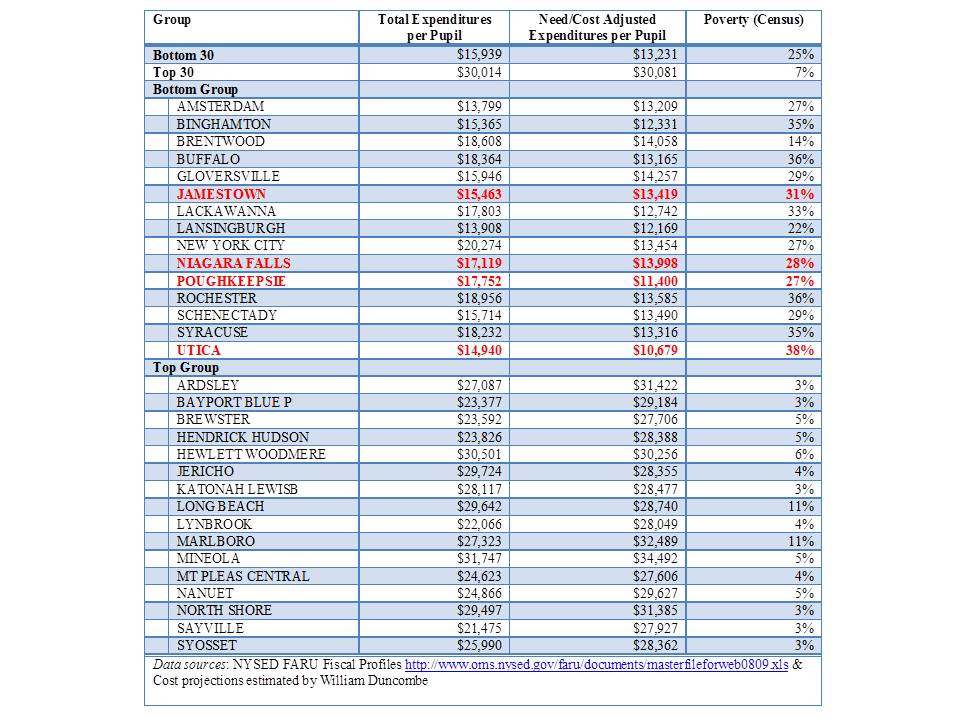 This is a snapshot if the total expenditures per pupil and the need and cost adjusted expenditures per pupil of some of the MOST and LEAST advantaged school districts in New York State (in terms of a mix of need & spending measures). Without any adjustment for needs and costs, the high poverty, high need districts in many cases are spending below $16,000 per pupil, and the Top 30 districts nearly double that. When adjusted for needs/costs, the disparities widen dramatically.