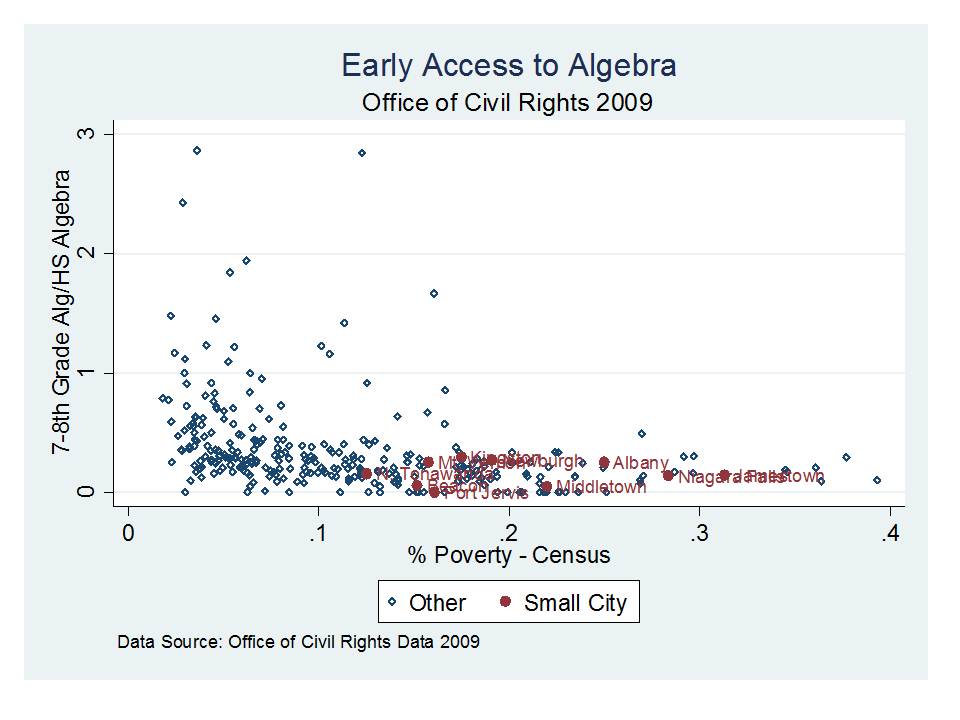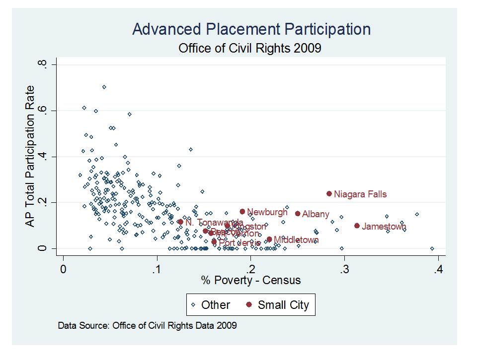 First, here are a few slides using data from the Office of Civil Rights data collection on AP participation rates and participation in other key milestone courses.These data are shown with respect to district poverty rates, and poor small city districts (and some less poor, but still not advantaged ones) are highlighted.