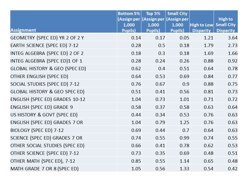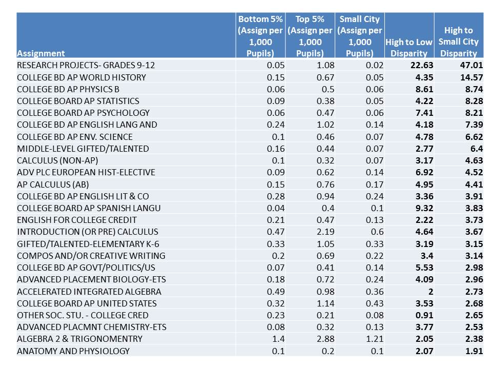 The contrast between the top 30 and bottom 30 (and small city) districts in New York State, as evidenced by the allocation of teaching assignments is striking and disturbing. Let’s start with allocation of teaching assignments to advanced and college credit courses (all are not included). I’ve tallied teaching assignments per 1,000 student (in the group of schools, excluding NYC) based on statewide staffing data from 2010-11.This is very preliminary stuff, from a large data set on all teacher assignments in NY State.