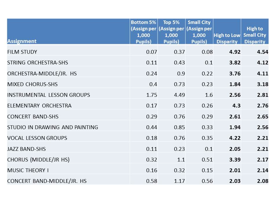 On average, most middle and secondary music and arts staffing assignments also run at about a 2 fold or greater disparity between high and low need/resource districts in New York State. Kids in high need, low resource, low outcome districts have substantially less access to band, chorus, orchestra, private instrumental or vocal lessons…. and JAZZ BAND! This is not an exhaustive list. And a handful of arts opportunities are allocated roughly with parity (1:1), but high need, low resource districts do not have substantially greater resources allocated to any of these areas and generally have much less.