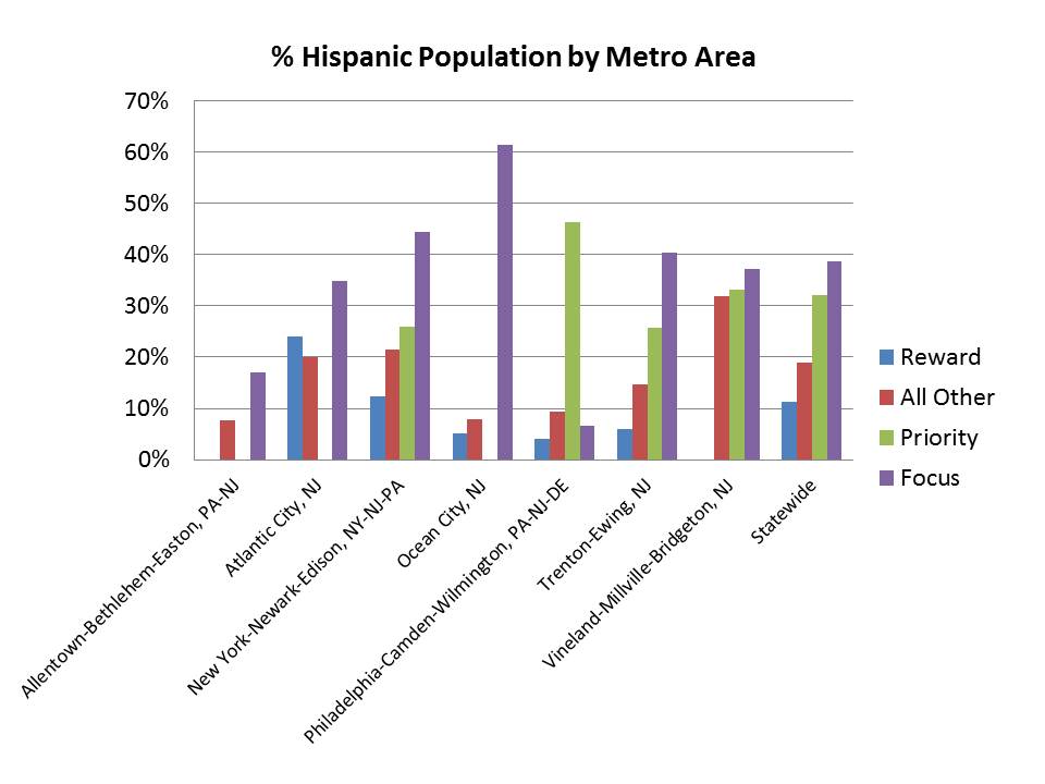 [note: several NJ schools had missing data in the 2009-10 NCES Common Core of Data which were merged with the NJDOE schools list http://www.njspotlight.com/assets/11/1116/2300. Total school enrollment data were most commonly missing, and where possible were replaced with the sum of racial subgroup data for calculating racial composition. Complete data were matched and available for 160 of the 177(9?) focus schools and 120 of the 138(?) reward schools. Thus, I am sufficiently confident that the above patterns will hold as remaining missing data are added.]