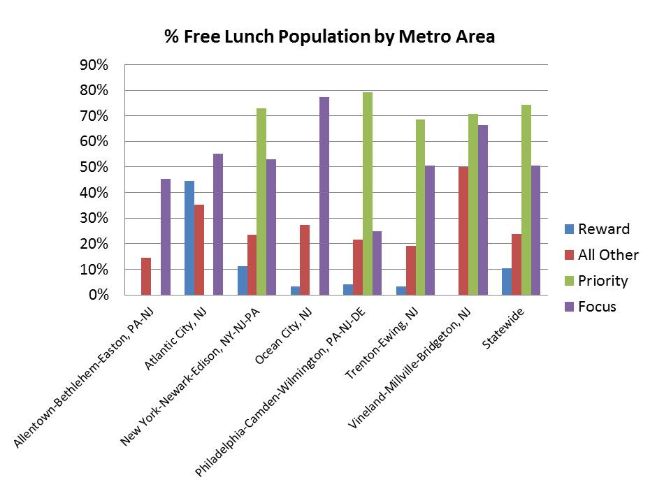 The NJDOE waiver proposal includes explanation of a new classification system for identifying which schools should be subject to state intervention, ultimately to be managed by regional offices throughout the state. This new targeted intervention system classifies districts in need of intervention as “priority” districts, with specific emphasis on “focus” districts. Mooney explains: