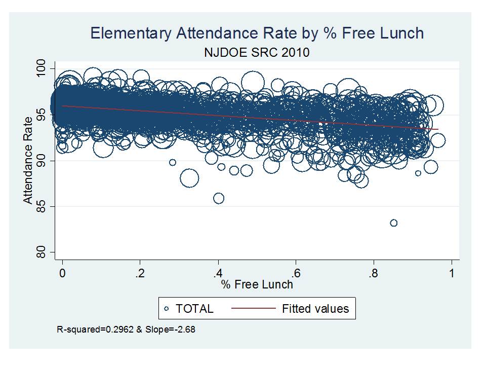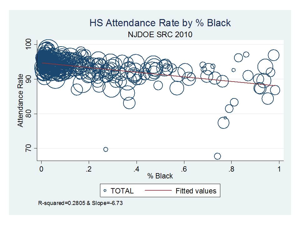 So, just how disparate are attendance rates across New Jersey school districts, by race and low income status, as well as by district factor grouping? Here are a few quick graphs based on the 2010-11 school level data on enrollments (enr file from NJDOE) and attendance rates (school report card d-base).