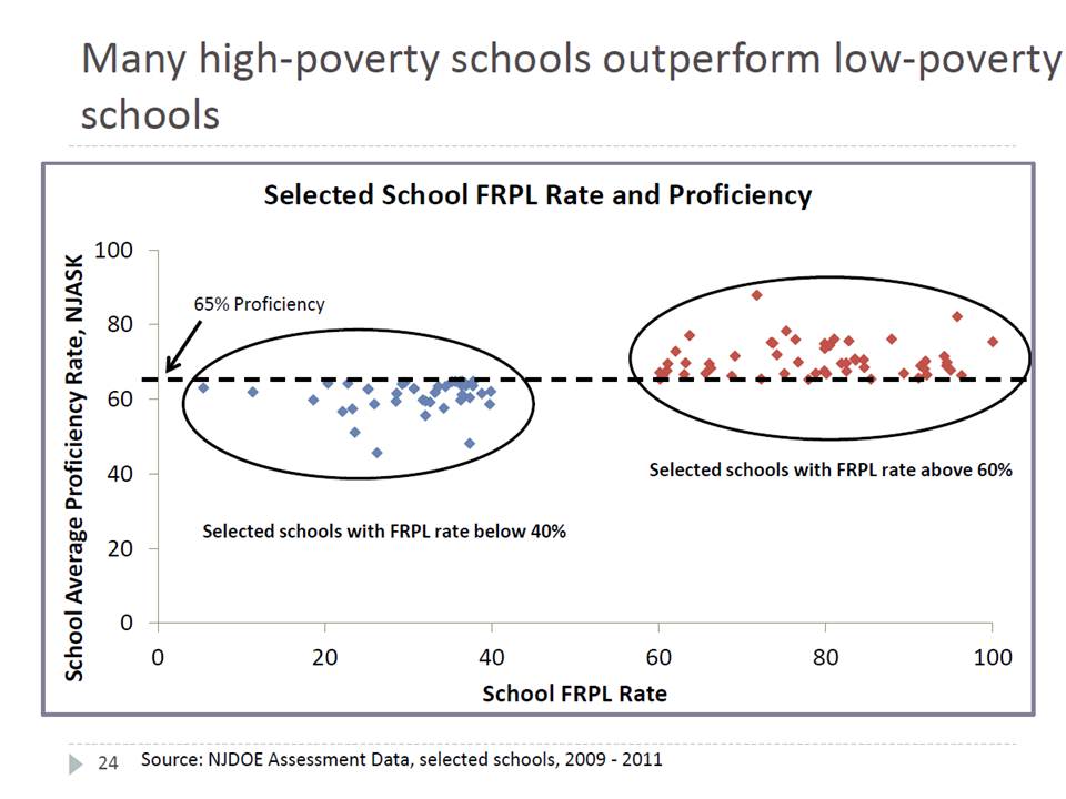 The title conveys the intended point of the graph – that if you look hard enough across New Jersey – you can find not only some, but MANY higher poverty schools that perform better than lower poverty schools.