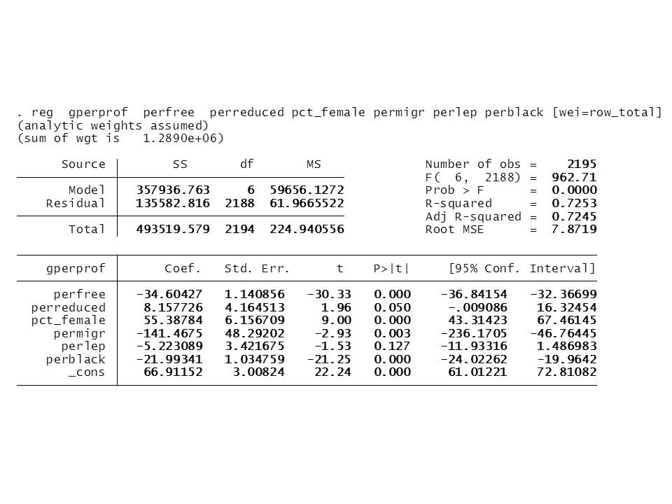 But, % free lunch remains the dominant factor, along with % black and % female. Combining free/reduced produces a somewhat weaker effect than using % free alone.