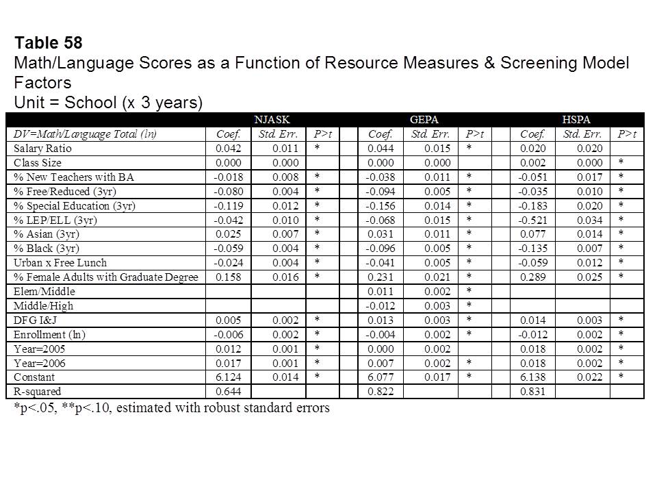 What we found was that poverty (measured by % free lunch) indeed strongly affects the costs of improving student outcomes, specifically applied to New Jersey districts, in one case focusing only on K-12 unified districts and in the second case all NJ districts. This finding is not a revelation.