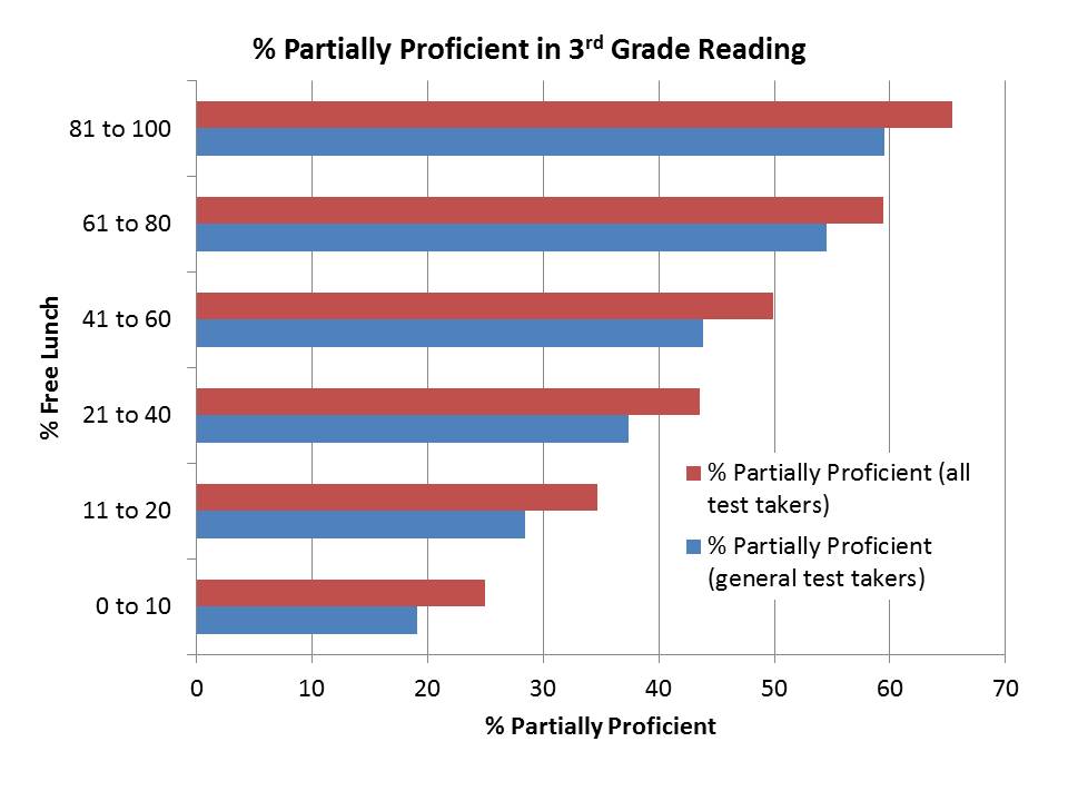 The problem here is that it’s completely absurd to compare total counts of students who are non-proficient across groups without any regard for the total counts of all students. That is, what percent of kids are proficient in each poverty group. Well, here’s what that picture ends up looking like: