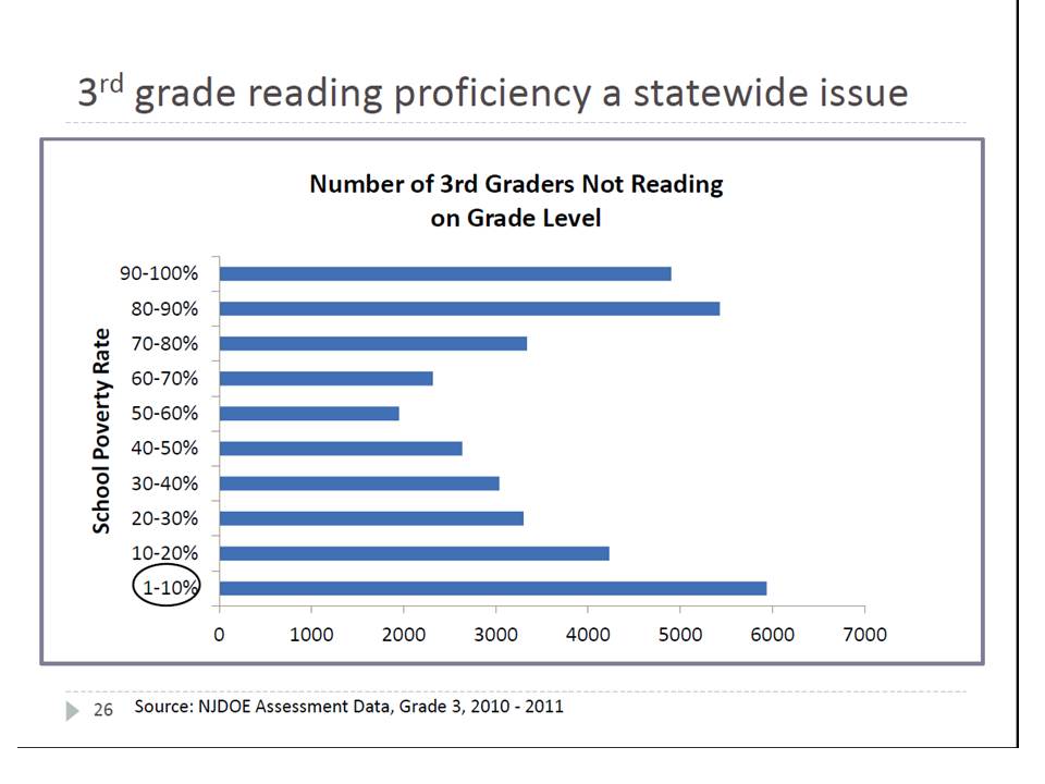 Also, the NJDOE and Chris Cerf use the mistaken label “Reading on Grade Level” but, the information comes from the NJASK. The NJASK does not measure grade level reading. The NJASK section in question measures reading AND writing but makes not mention at all to grade level reading ability. To someone not in the field of education, it would be easy to dismiss the error. ;However, for the NJDOE AND the Acting Commissoner of Education to be ignorant of the difference is quite embarrassing, to say the least.