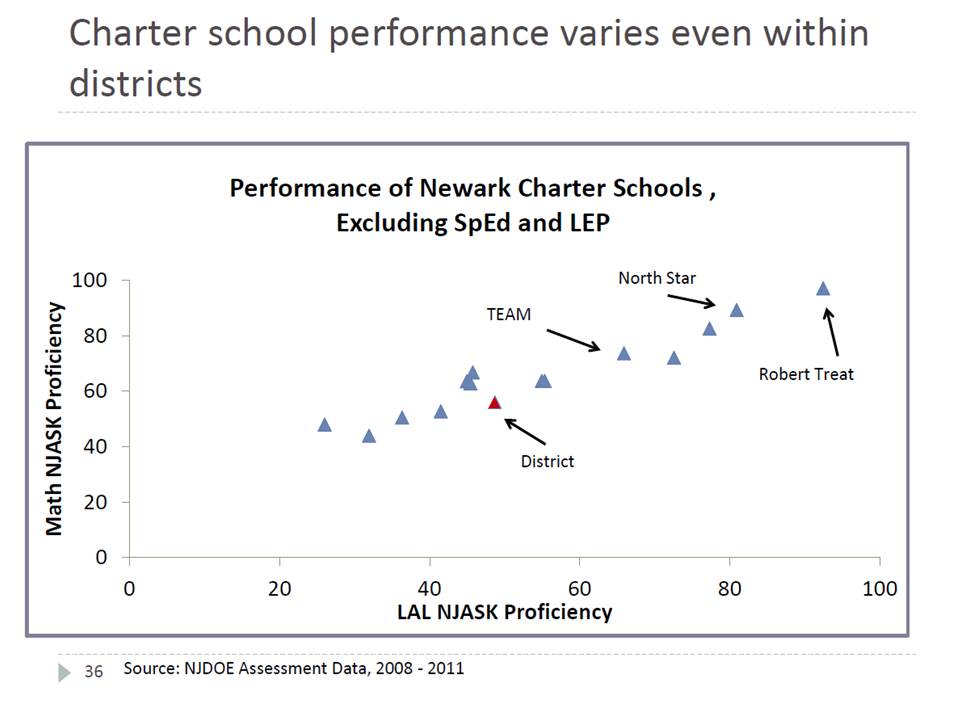 Among other things, while the first graph appears to suggest that TEAM Academy is a relative laggard compared to schools like North Star or Robert Treat, my representation here shows that TEAM is actually further above it’s expected performance than either of the other two. TEAM simply serves a lower income population than the other two. Further, district schools serving similar populations do similarly well. And several charter schools do as poorly (and worse) than comparable district schools.