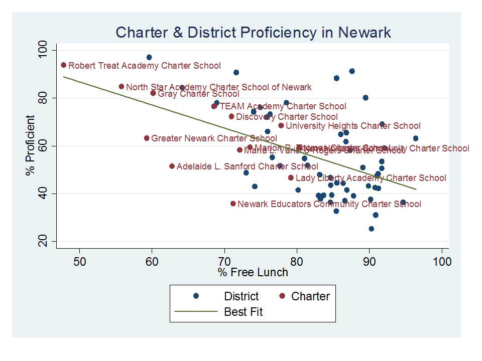 In this case, the title is somewhat appropriate in that charter school performance does indeed vary in Newark. But the graph is pretty much meaningless and deceptive.